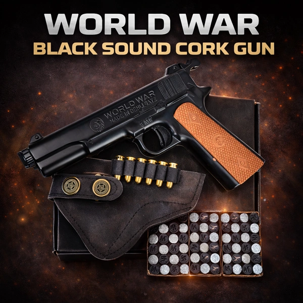 Enjoy realistic action and safe fun with the World War Black Sound Cork Gun Set. Designed with a bold black finish and vintage military style, this toy pistol delivers an exciting “pop” sound using corks—perfect for kids and collectors. The complete set includes 60 sound corks, 6 golden dummy bullets, and a premium holster cover for a complete play and display experience.